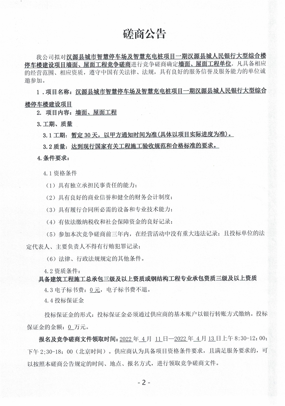 城投建工漢源縣城市智慧停車場及智慧充電樁項目一期漢源縣城人民銀行大型綜合樓停車樓建設項目墻面、屋面工程競爭磋商公告