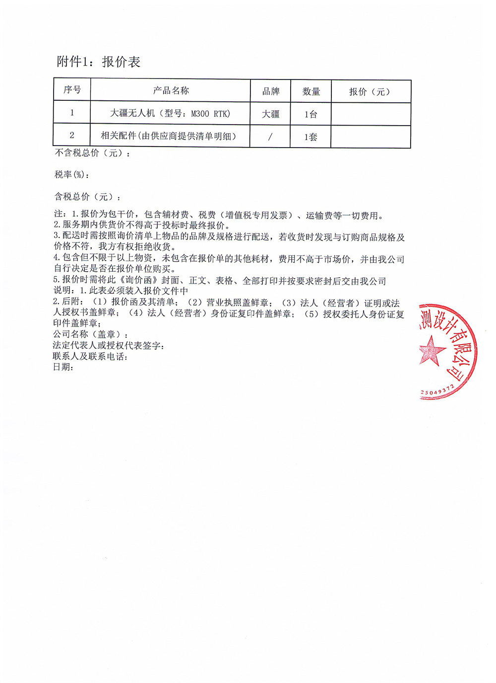 黎明勘測公司購買大疆無人機(jī)(型號:M300 RTK)詢價(jià)函