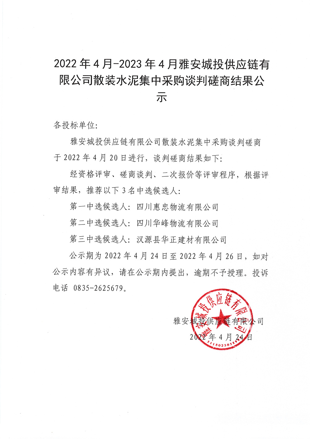 2022年4月-2023年4月雅安城投供應鏈有限公司散裝水泥采購談判磋商結果公示