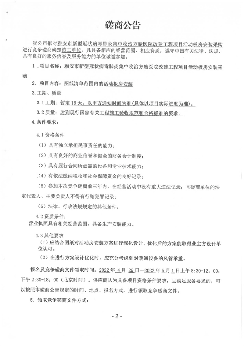 雅安市新型冠狀病毒肺炎集中收治方艙醫(yī)院改建工程項(xiàng)目活動(dòng)板房采購(gòu)磋商公告