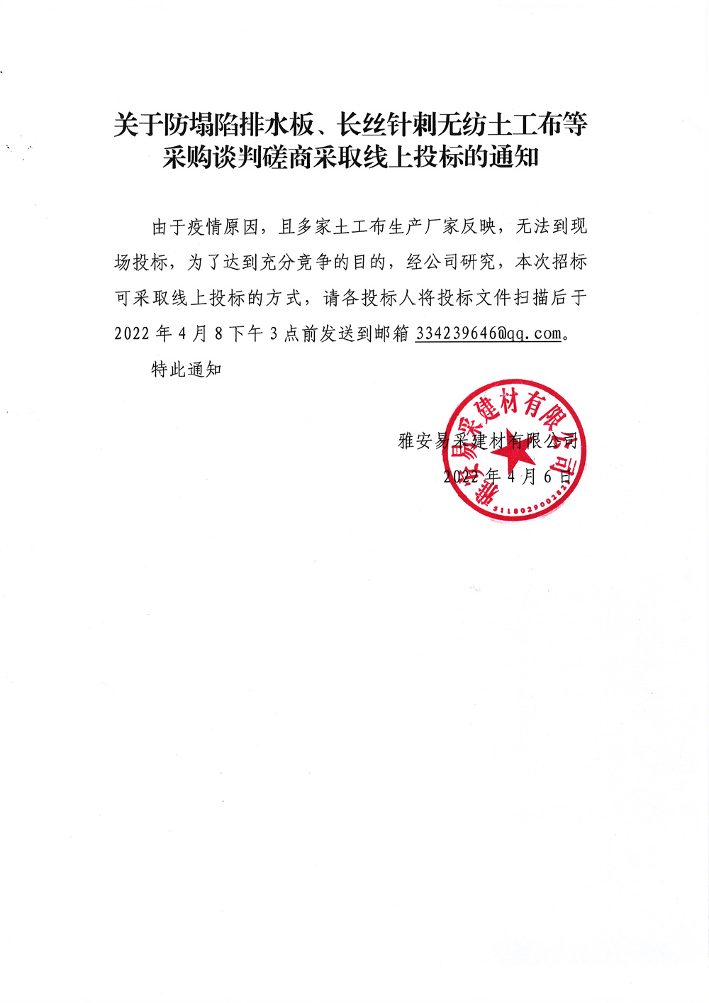 雅安易采建材有限公司防塌陷排水板、長絲針刺無紡土工布等采購談判磋商采取線上投標的通知