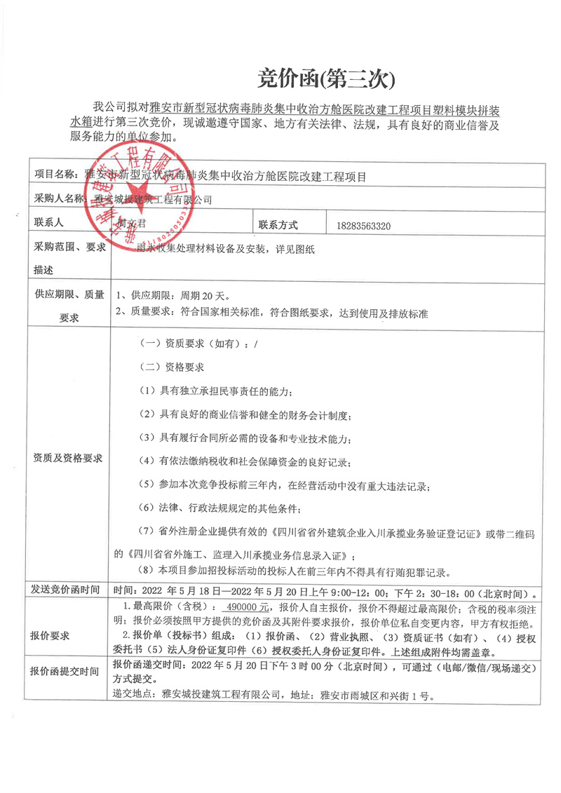 雅安市新型冠狀病毒肺炎集中收治方艙醫(yī)院改建工程項(xiàng)目塑料模塊拼裝水箱競(jìng)價(jià)函(第三次)