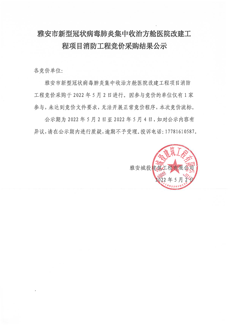 雅安市新型冠狀病毒肺炎集中收治方艙醫(yī)院改建工程項目消防工程競價采購結(jié)果公示