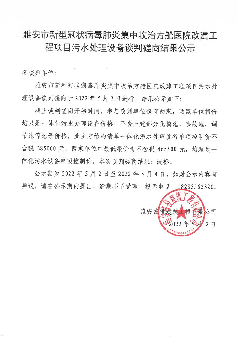雅安市新型冠狀病毒肺炎集中收治方艙醫(yī)院改建工程項目污水處理設備談判磋商結(jié)果公示