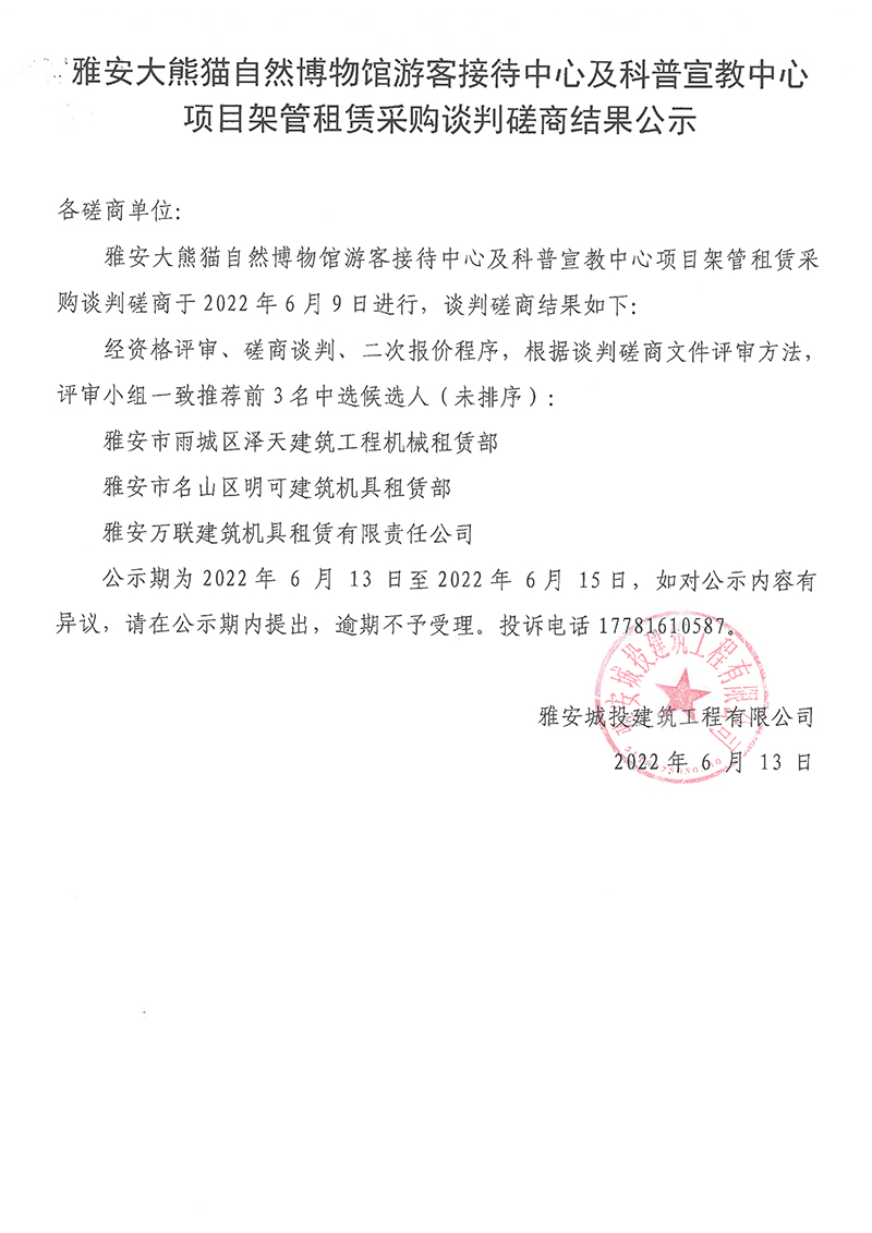 雅安大熊貓自然博物館旅游接待中心及科普宣教中心項(xiàng)目架管租賃談判磋商結(jié)果公示