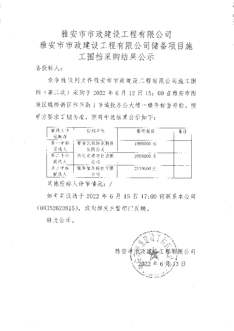 雅安市市政建設(shè)工程有限公司儲(chǔ)備項(xiàng)目施工圍擋招采結(jié)果公示