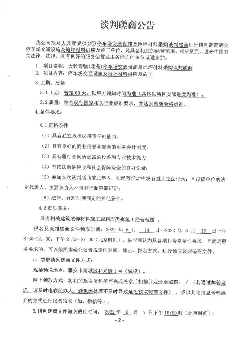 大興壹號(北苑)停車場交通設(shè)施及地坪材料采購談判磋商公告