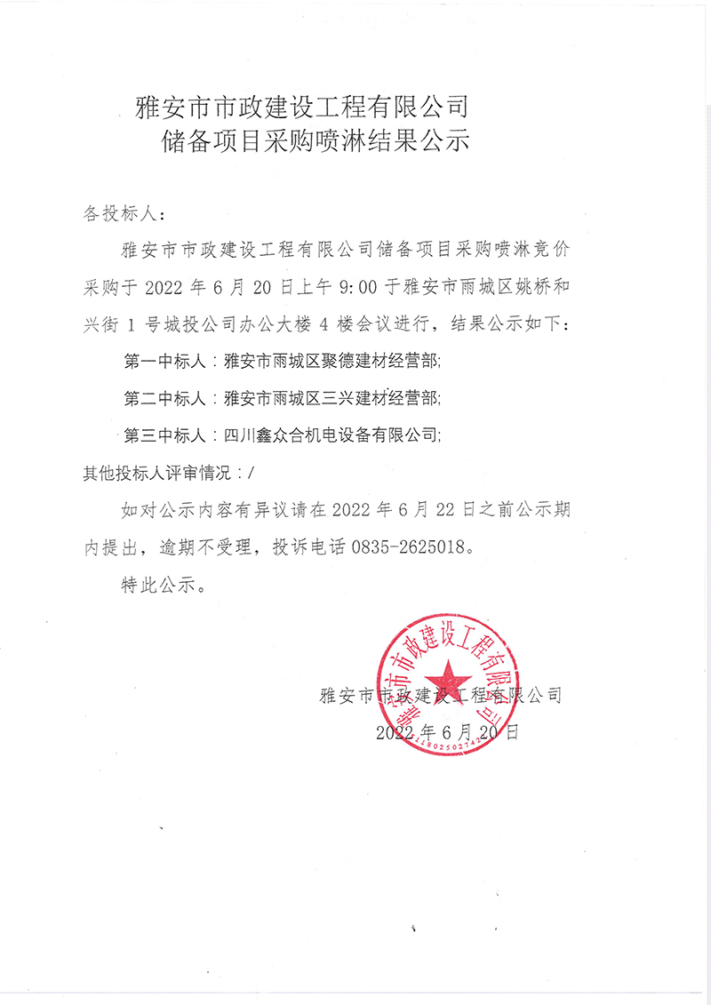 雅安市市政建設(shè)工程有限公司儲備項(xiàng)目噴淋系統(tǒng)結(jié)果公示