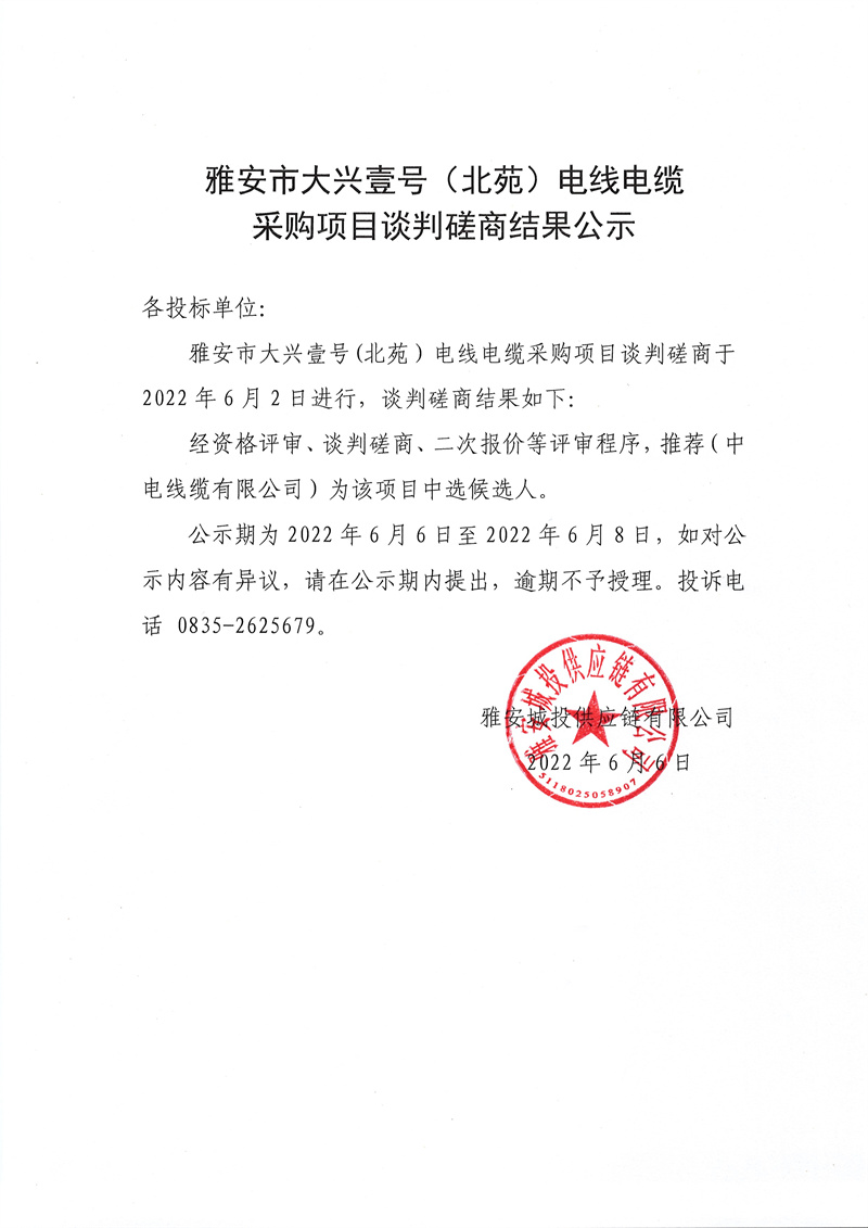 雅安城投供應(yīng)鏈有限公司大興壹號(北苑)項目電線電纜談判磋商結(jié)果公示