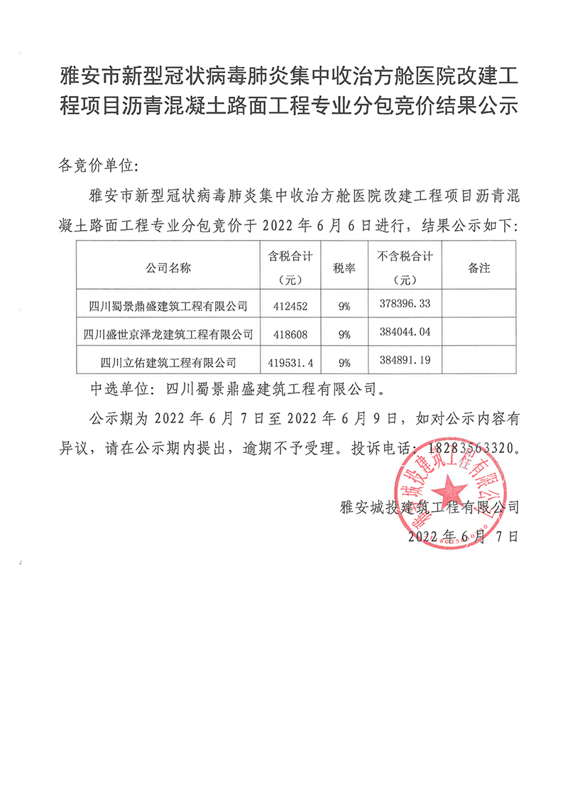 雅安市新型冠狀病毒肺炎集中收治方艙醫(yī)院改建工程項目瀝青混凝土路面工程專業(yè)分包競價結(jié)果公示
