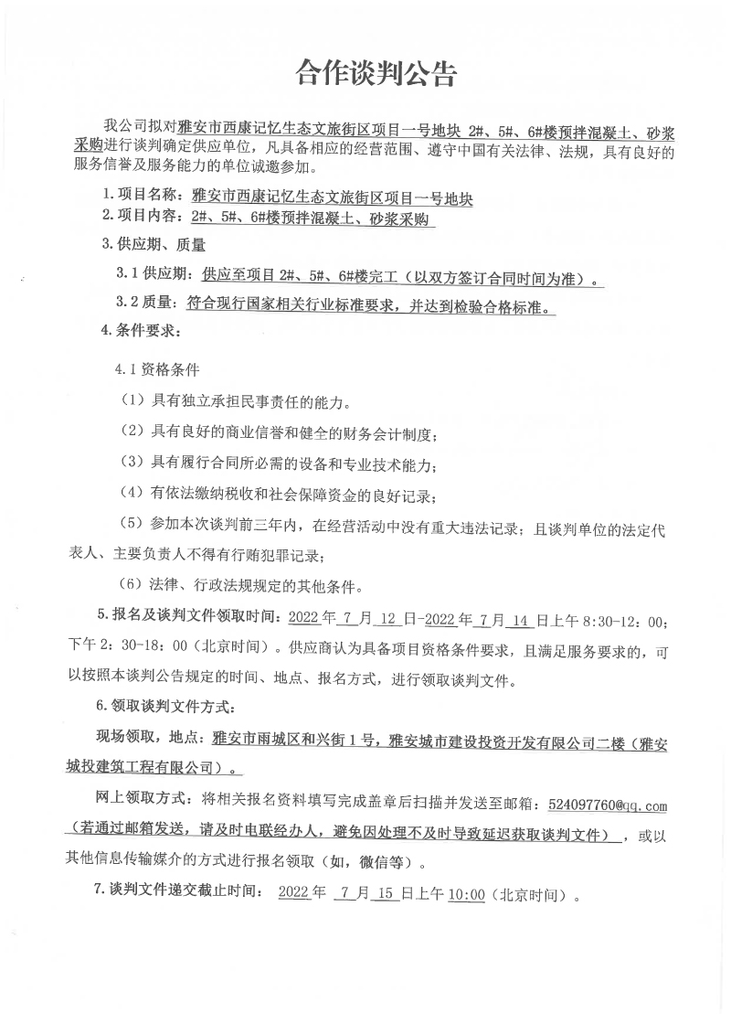 雅安市西康記憶生態(tài)文旅街區(qū)項目一號地塊2#、5#、6#樓預(yù)拌混凝土、砂漿采購合作談判公告