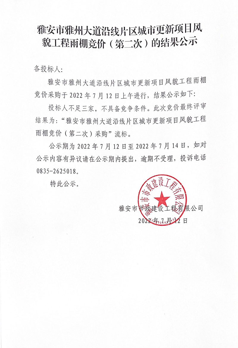 雅安市雅州大道沿線片區(qū)城市更新項目風(fēng)貌工程雨棚競價(第二次)的結(jié)果公示