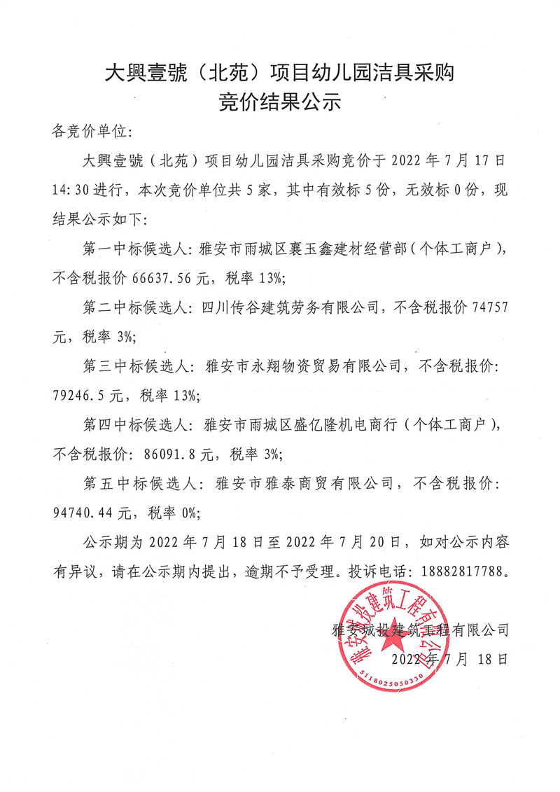 大興壹號(北苑)項目幼兒園潔具采購競價結(jié)果公示