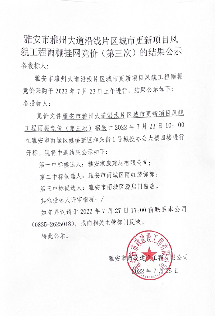 雅安市雅州大道沿線片區(qū)城市更新項(xiàng)目風(fēng)貌工程雨棚競價(第三次)的結(jié)果公示