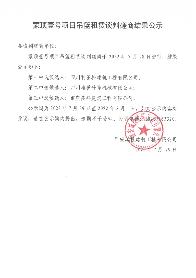 蒙頂壹號(hào)項(xiàng)目吊籃租賃談判磋商結(jié)果公示