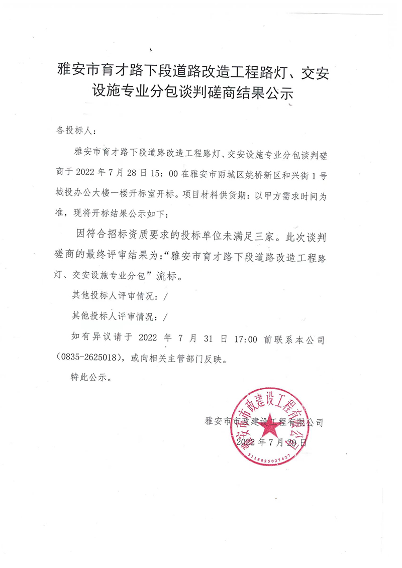 雅安市育才路下段道路改造工程路燈、交安設施專業(yè)分包談判磋商結果公示