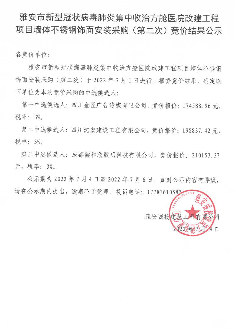 雅安市新型冠狀病毒肺炎集中收治方艙醫(yī)院改建工程項(xiàng)目墻體不銹鋼飾面安裝采購(gòu)(第二次)競(jìng)價(jià)結(jié)果公示