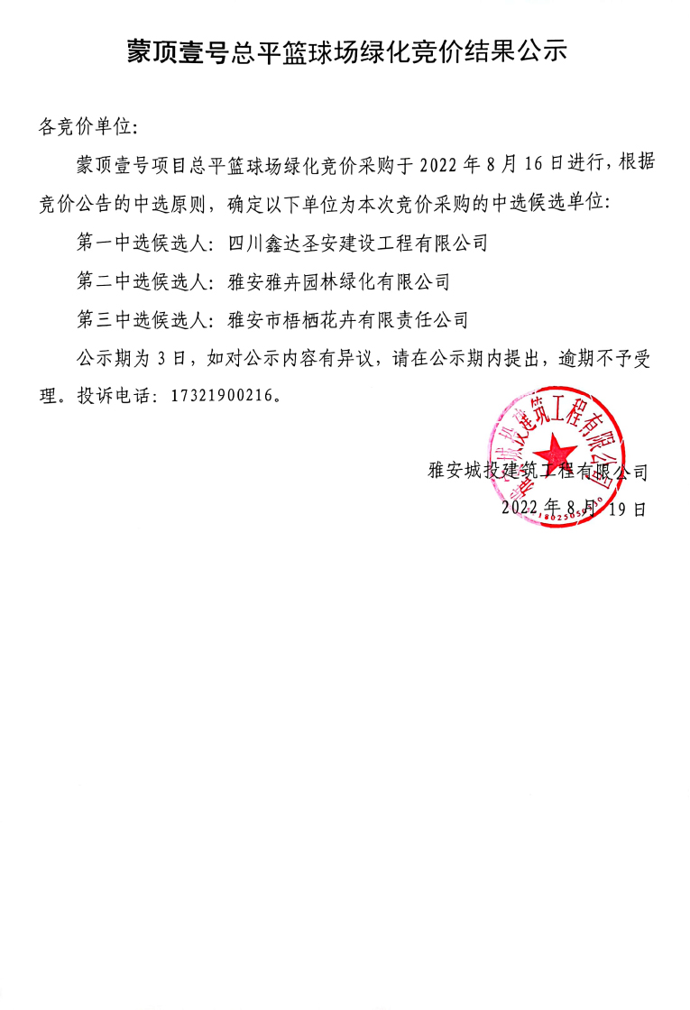 蒙頂壹號項(xiàng)目總平籃球場綠化競價(jià)結(jié)果公示