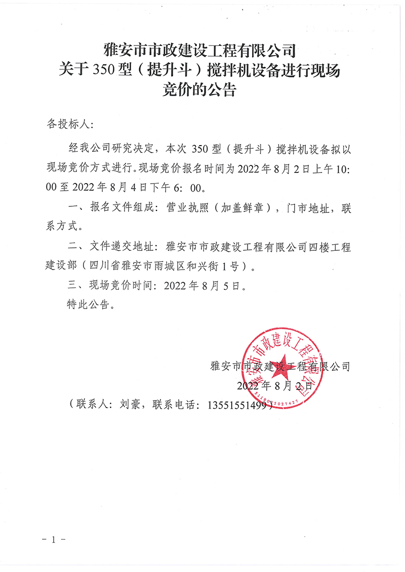 關(guān)于350型(提升斗)攪拌機設備進行現(xiàn)場競價的公告