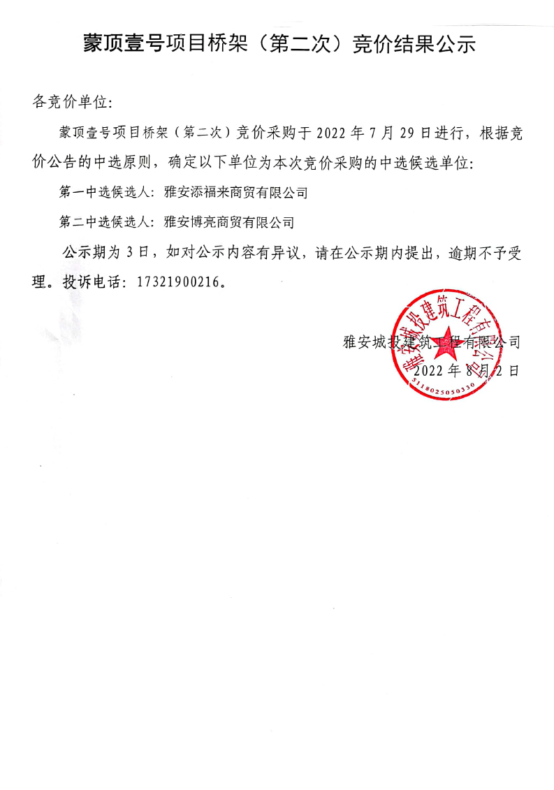 蒙頂壹號(hào)項(xiàng)目橋架(第二次)競價(jià)結(jié)果公示