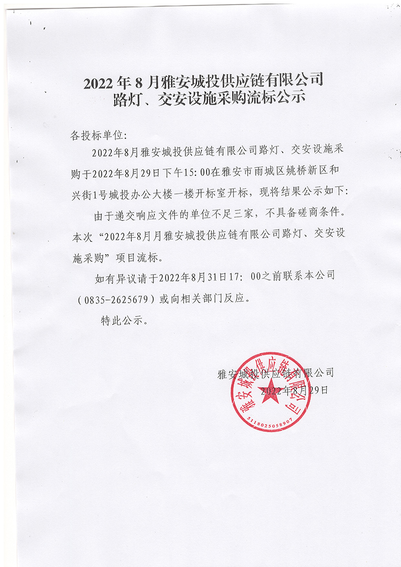 2022年8月雅安城投供應(yīng)鏈有限公司路燈、交安設(shè)施采購(gòu)流標(biāo)公示