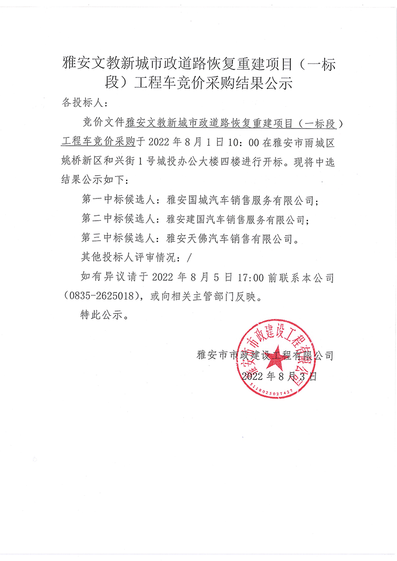 雅安文教新城市政道路恢復(fù)重建項目(一標(biāo)段)工程車競價采購結(jié)果公示