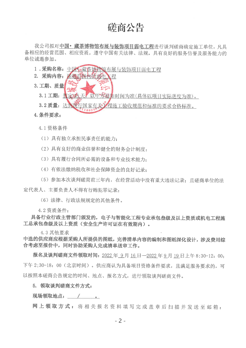 中國(guó)• 藏茶博物館布展與裝飾項(xiàng)目弱電工程談判磋商公告