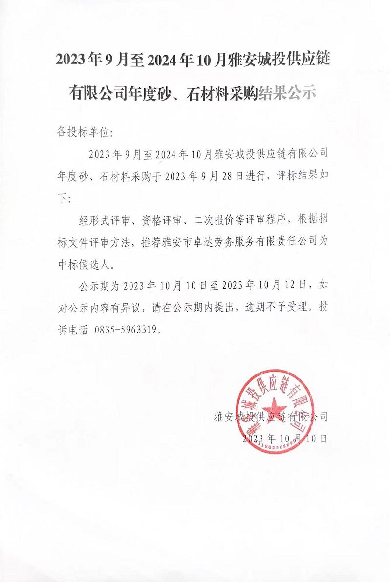 2023年9月至2024年10月雅安城投供應(yīng)鏈有限公司年度砂、石材料采購結(jié)果公示