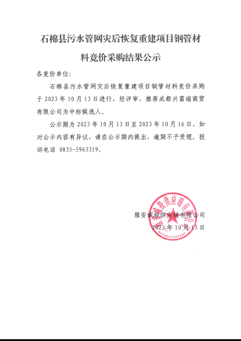 石棉縣污水管網(wǎng)災后恢復重建項目鋼管材料競價采購結(jié)果公示