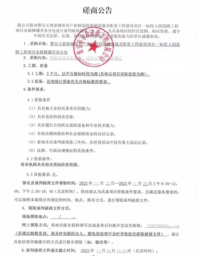 雅安文教新城體育產(chǎn)業(yè)制造園基礎(chǔ)設(shè)施及配套工程建設(shè)項(xiàng)目一標(biāo)段入園道路工程項(xiàng)目水穩(wěn)攤鋪勞務(wù)分包磋商公告
