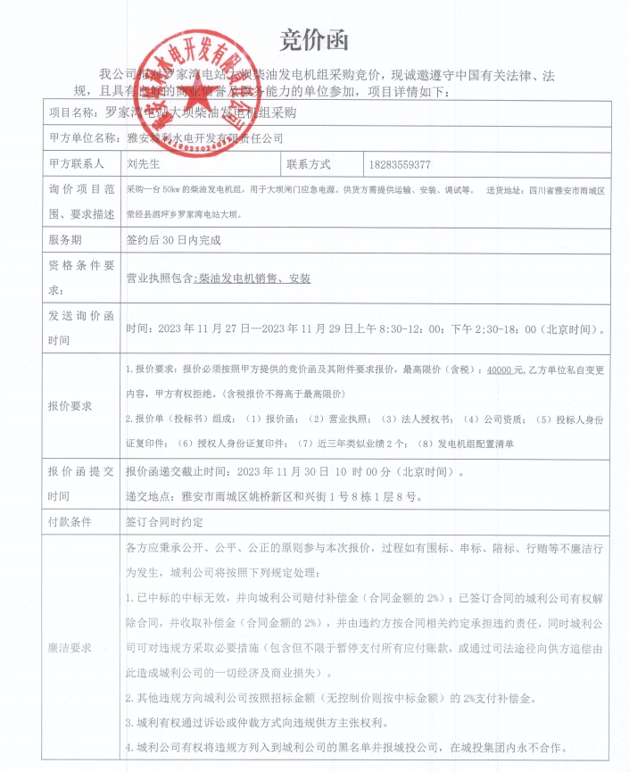 羅家灣電站大壩柴油發(fā)電機組采購競價公告