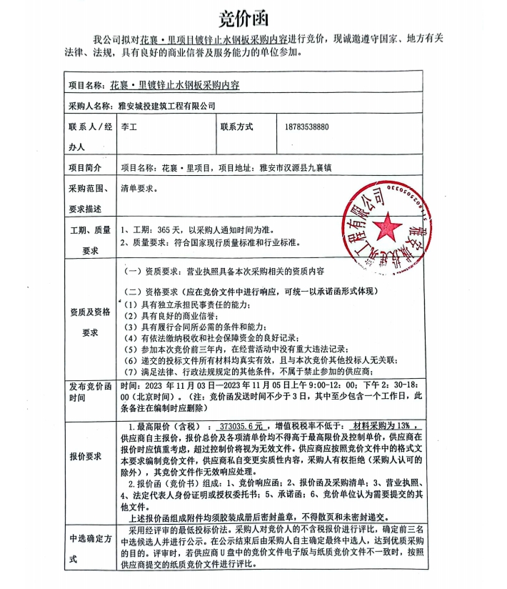 花襄·里項(xiàng)目鍍鋅止水鋼板采購(gòu)內(nèi)容競(jìng)價(jià)公告