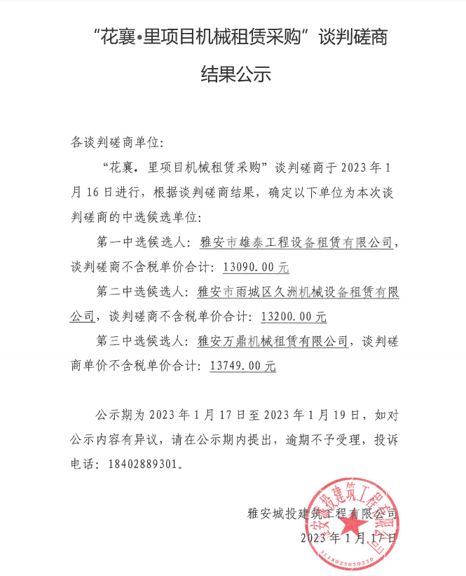 花襄·里項目機械租賃采購談判磋商結(jié)果公示