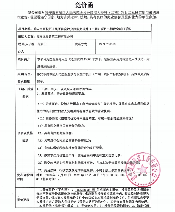 雅安市雨城區(qū)人民醫(yī)院金沙分院能力提升(二期)項(xiàng)目二標(biāo)段定制門采購(gòu)競(jìng)價(jià)公告