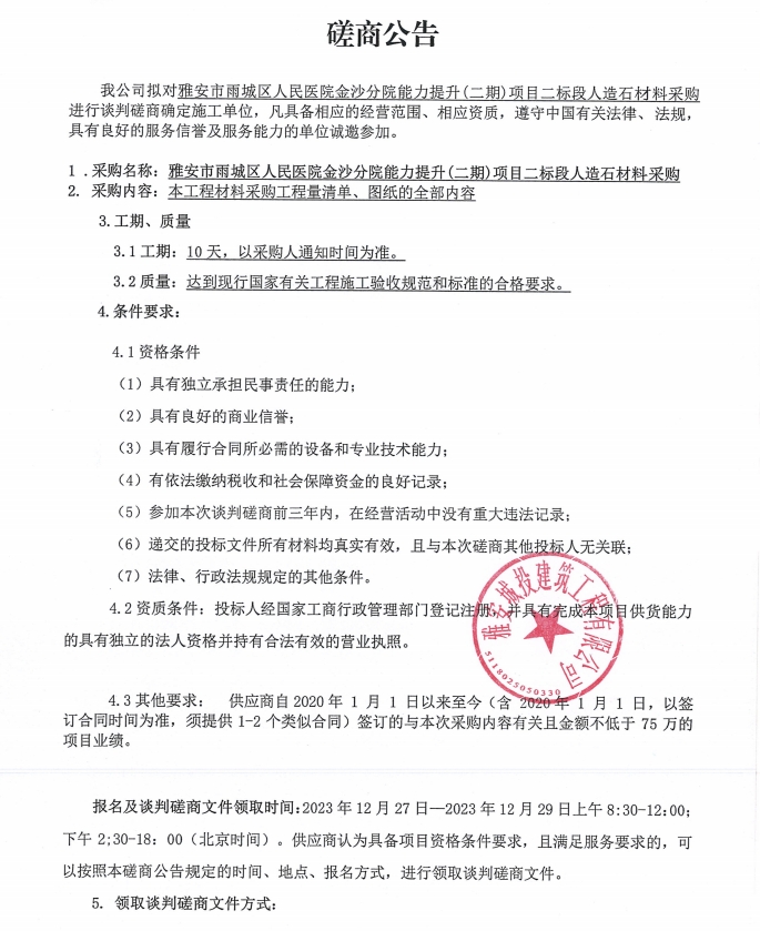 雅安市雨城區(qū)人民醫(yī)院金沙分院能力提升(二期)項(xiàng)目二標(biāo)段人造石材料采購(gòu)談判磋商公告