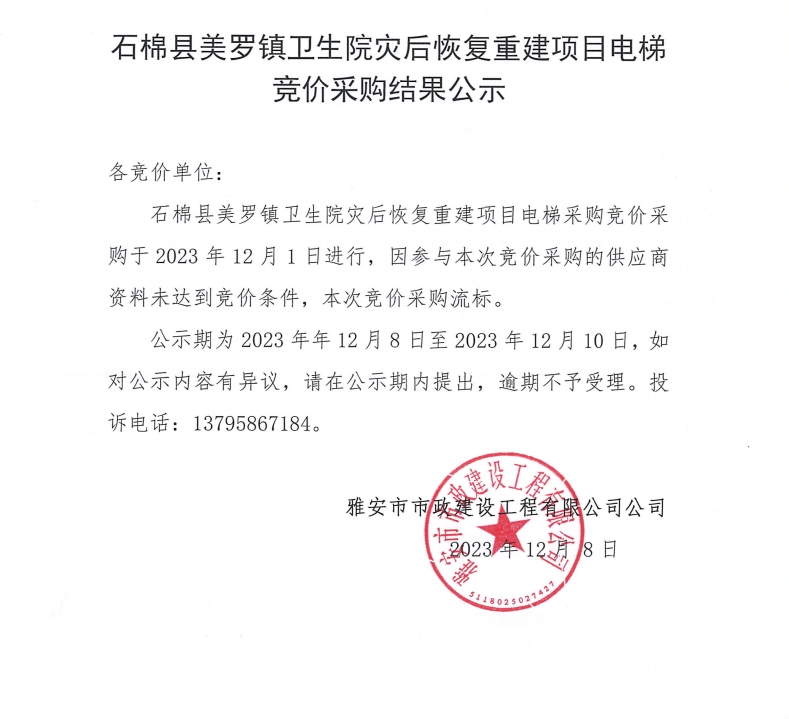 石棉縣美羅鎮(zhèn)衛(wèi)生院災(zāi)后恢復(fù)重建項(xiàng)目電梯競價(jià)采購結(jié)果公示