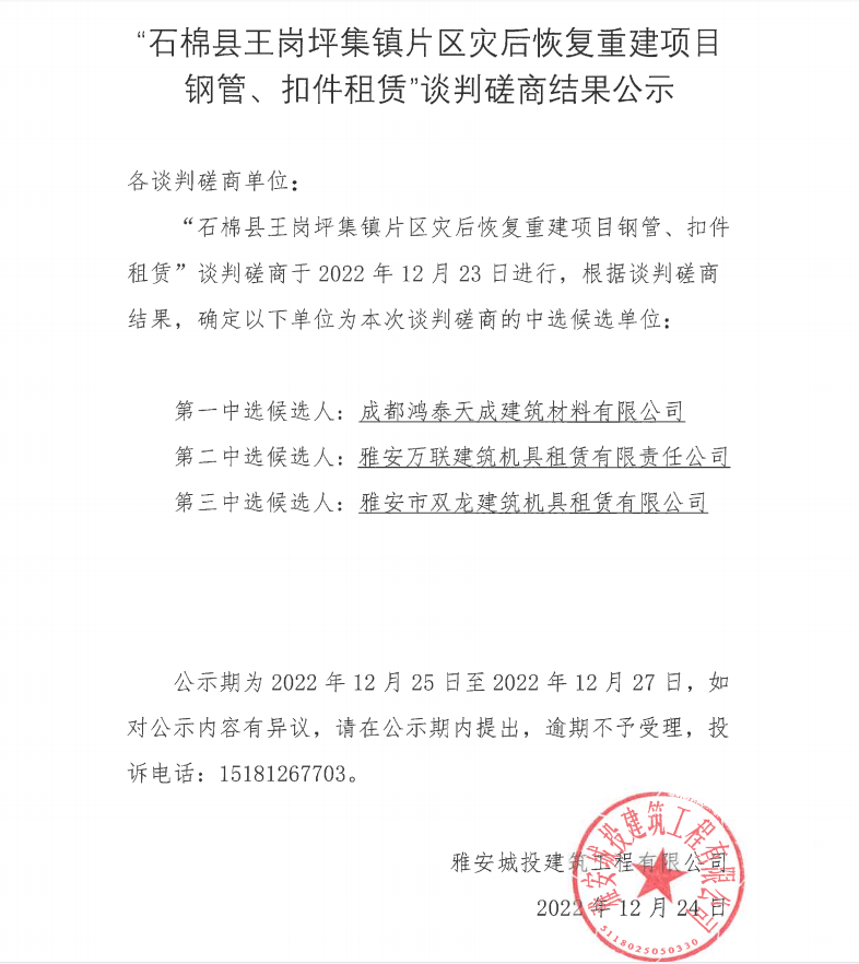 “石棉縣王崗坪集鎮(zhèn)片區(qū)災后恢復重建項目鋼管、扣件租賃”談判磋商結果公示
