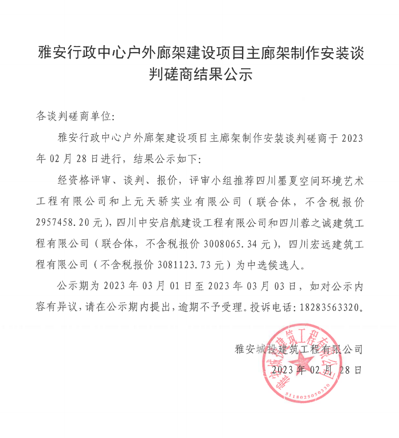 雅安行政中心戶外廊架建設(shè)項目主廊架制作安裝談判磋商結(jié)果公示