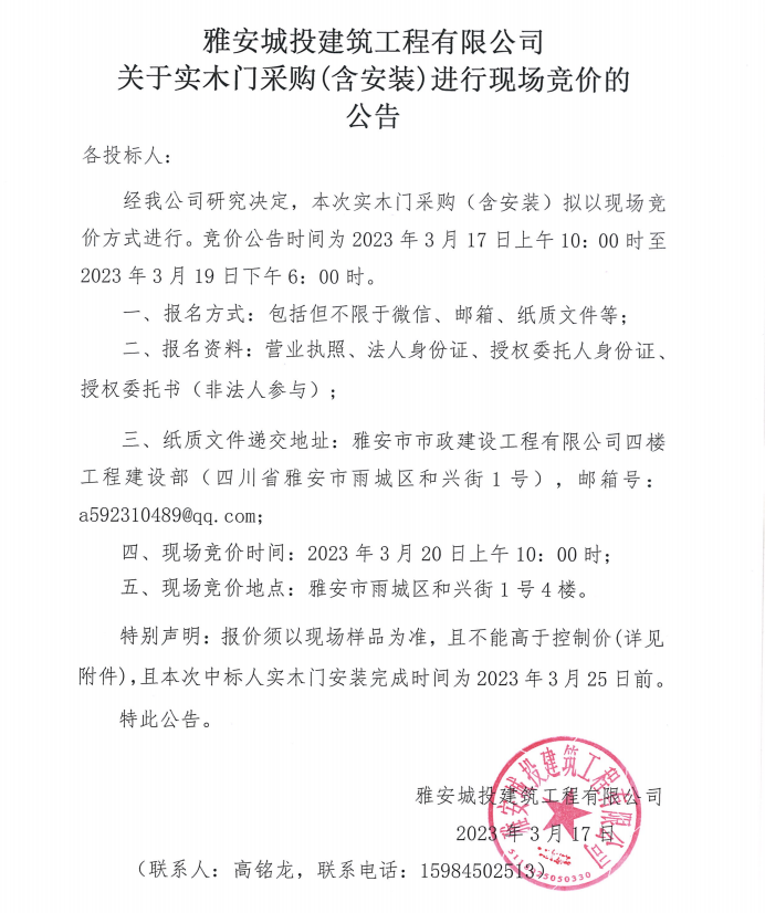 雅安城投建筑工程有限公司關于實木門采購(含安裝)進行現(xiàn)場競價的公告