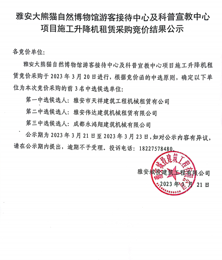 雅安大熊貓自然博物館游客接待中心及科普宣教中心項(xiàng)目施工升降機(jī)租賃采購競價(jià)結(jié)果公示