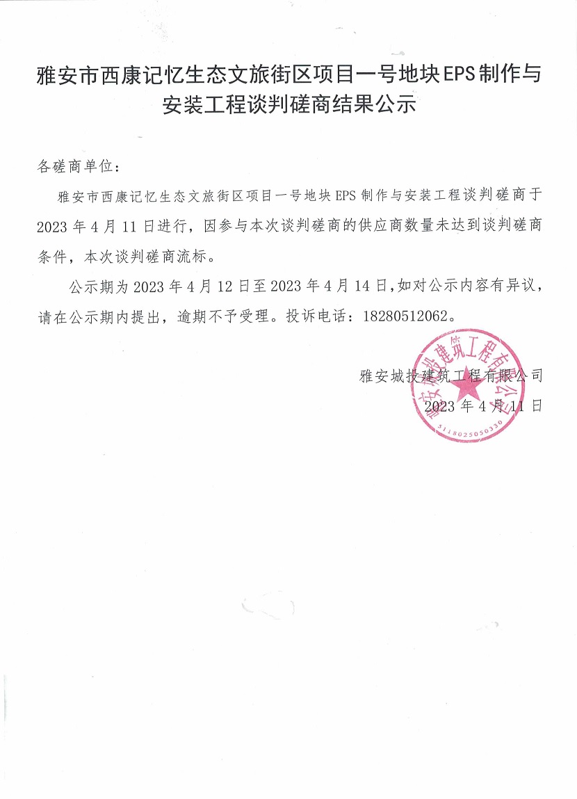 雅安市西康記憶生態(tài)文旅街區(qū)項目一號地塊EPS制作與安裝工程談判磋商結果公示