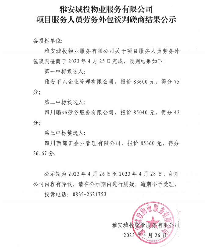 雅安城投物業(yè)服務有限公司項目服務人員勞務外包談判磋商結(jié)果公示