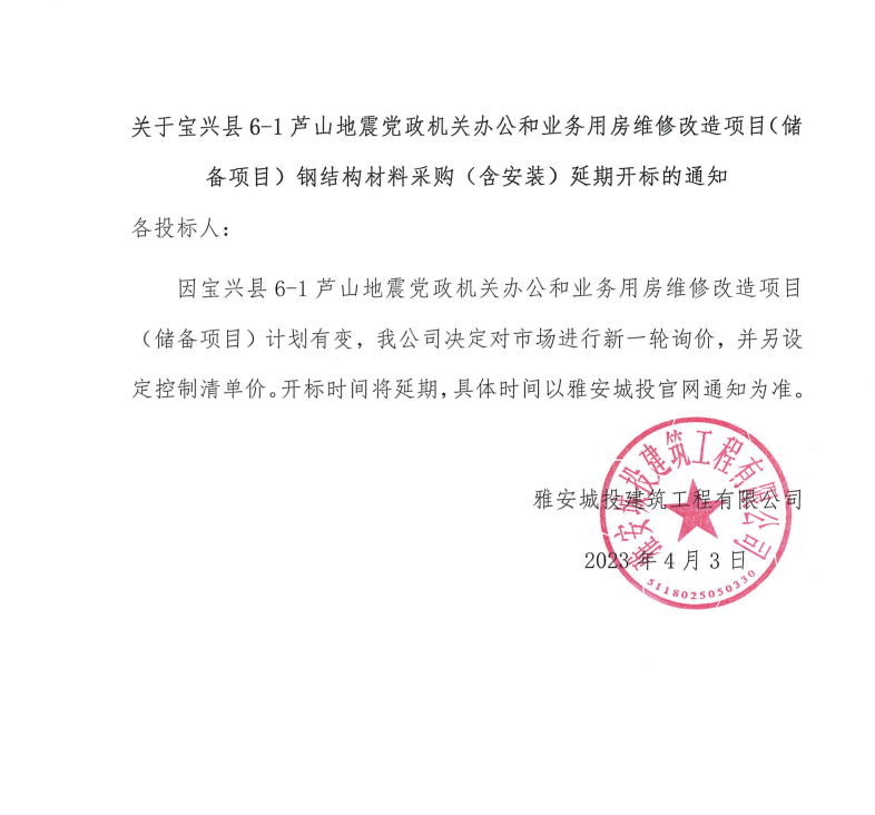 關于寶興縣6-1蘆山地震黨政機關辦公和業(yè)務用房維修改造項目(儲備項目)鋼結構材料采購(含安裝)延期開標的通知
