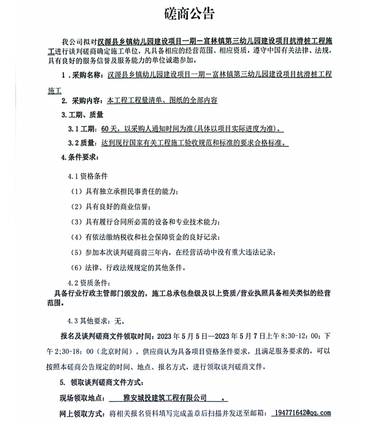 漢源縣鄉(xiāng)鎮(zhèn)幼兒園建設項目一期一富林鎮(zhèn)第三幼兒園建設項目抗滑樁工程施工談判磋商公告