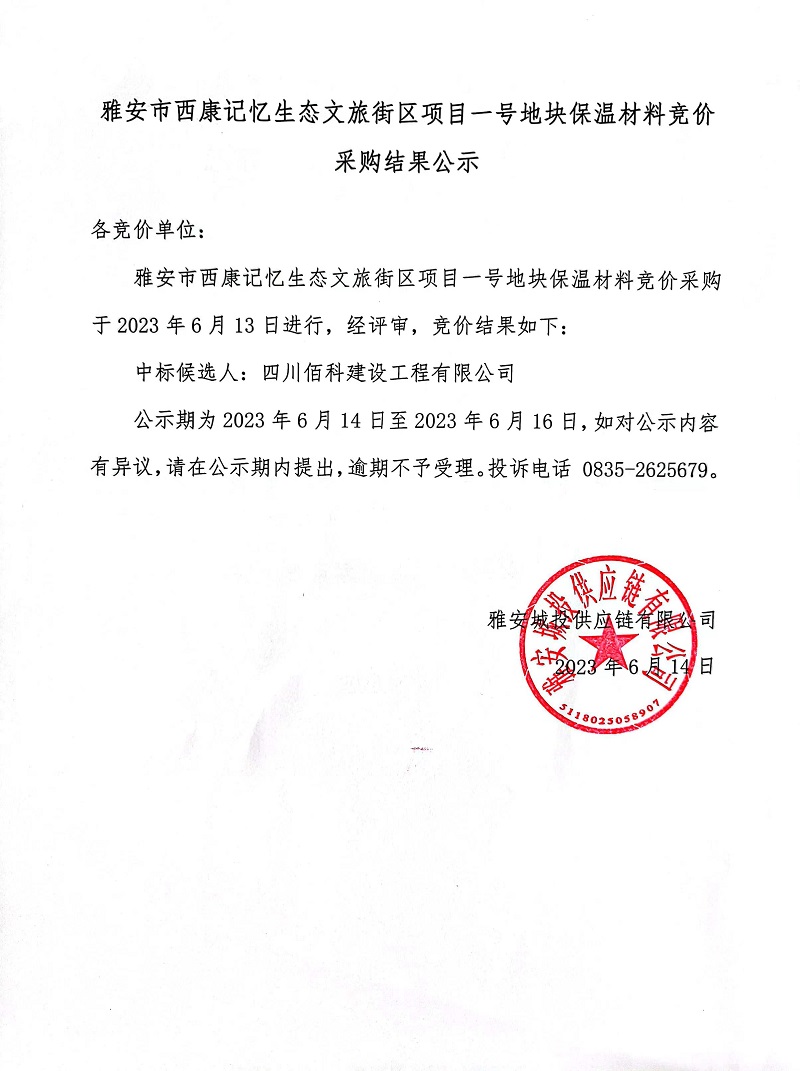 雅安市西康記憶生態(tài)文旅街區(qū)項(xiàng)目一號地塊保溫材料采購競價(jià)采購結(jié)果公示