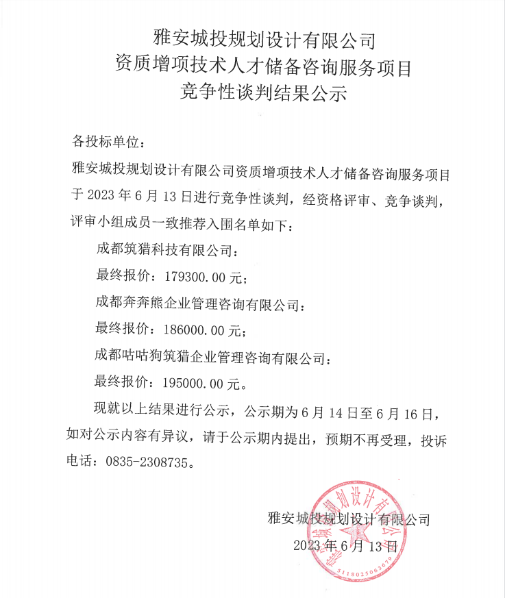 雅安城投規(guī)劃設(shè)計(jì)有限公司資質(zhì)增項(xiàng)技術(shù)人才儲備咨詢服務(wù)項(xiàng)目競爭性談判結(jié)果公示