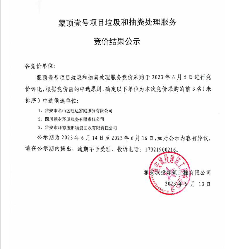 蒙頂壹號(hào)項(xiàng)目垃圾和抽糞處理服務(wù)競價(jià)結(jié)果公示