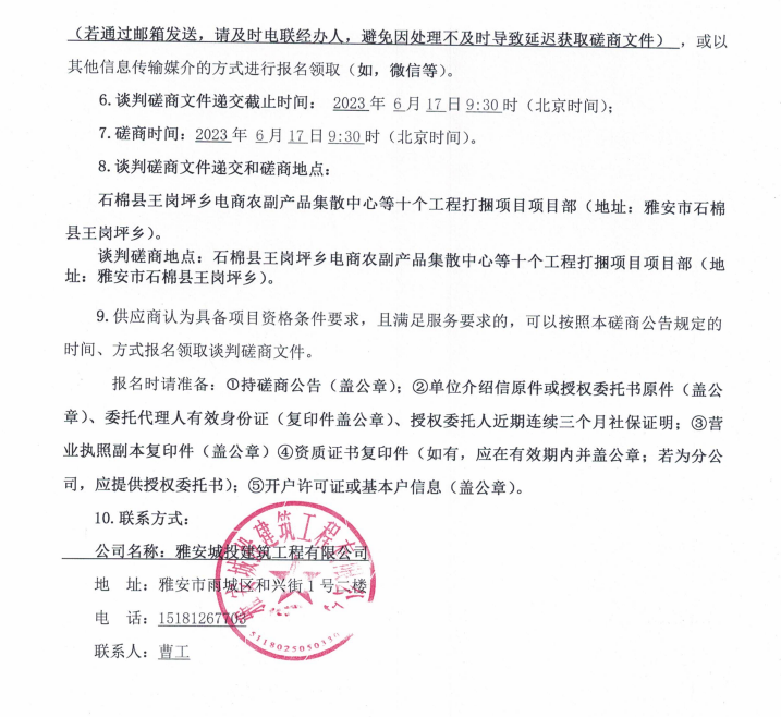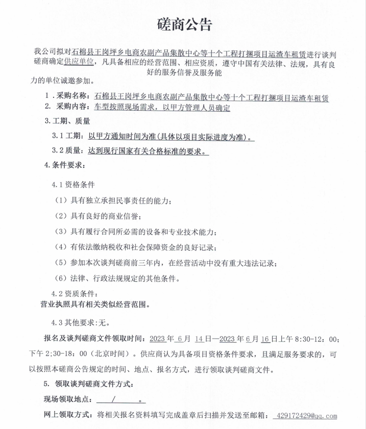 石棉縣王崗坪鄉(xiāng)電商農(nóng)副產(chǎn)品集散中心等十個(gè)工程打捆項(xiàng)目運(yùn)渣車(chē)租賃談判磋商公告