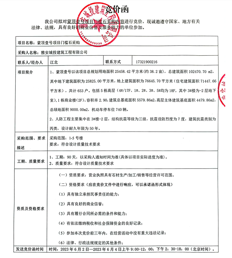 蒙頂壹號(hào)項(xiàng)目門檻石采購競(jìng)價(jià)公告