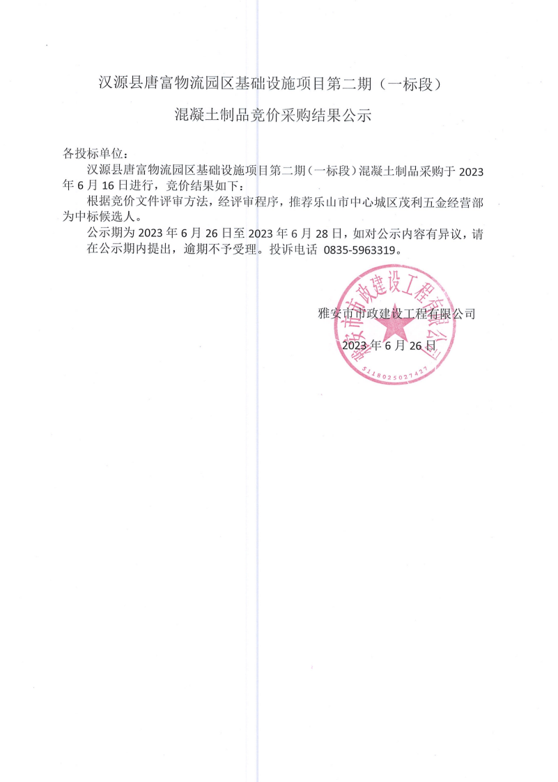 漢源縣唐富物流園區(qū)基礎(chǔ)設(shè)施項(xiàng)目第二期 (一標(biāo)段)混凝土制品采購(gòu)競(jìng)價(jià)結(jié)果公示